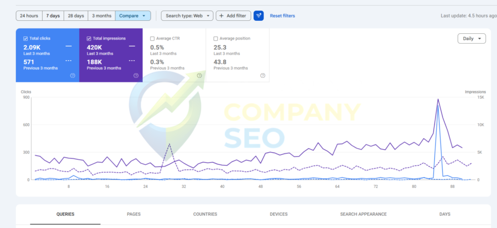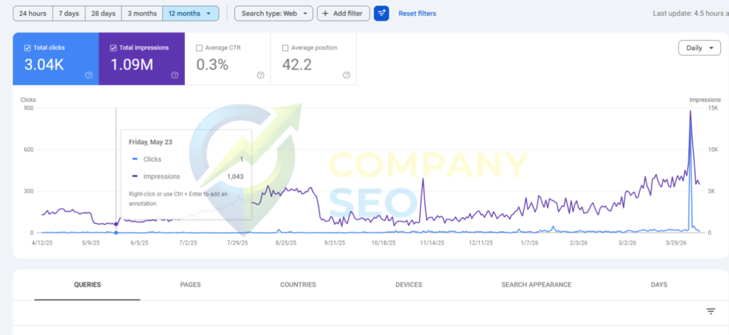 Today, the same business is generating 30–50 qualified leads every single month from organic search. Daily clicks have grown from 2 to 50. Impressions have crossed 1 million over the past 12 months. And key conversion events are up over 23,000%.