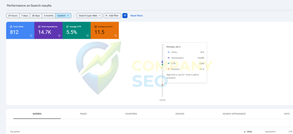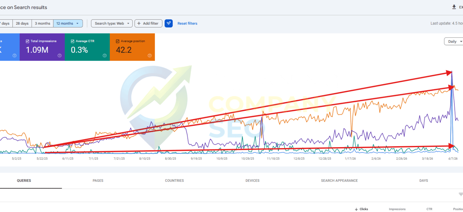 By April 2026, the same website recorded 48 clicks in a single day, with 8,909 impressions and an average ranking position of 14.3 — a near 50-point improvement in average position.